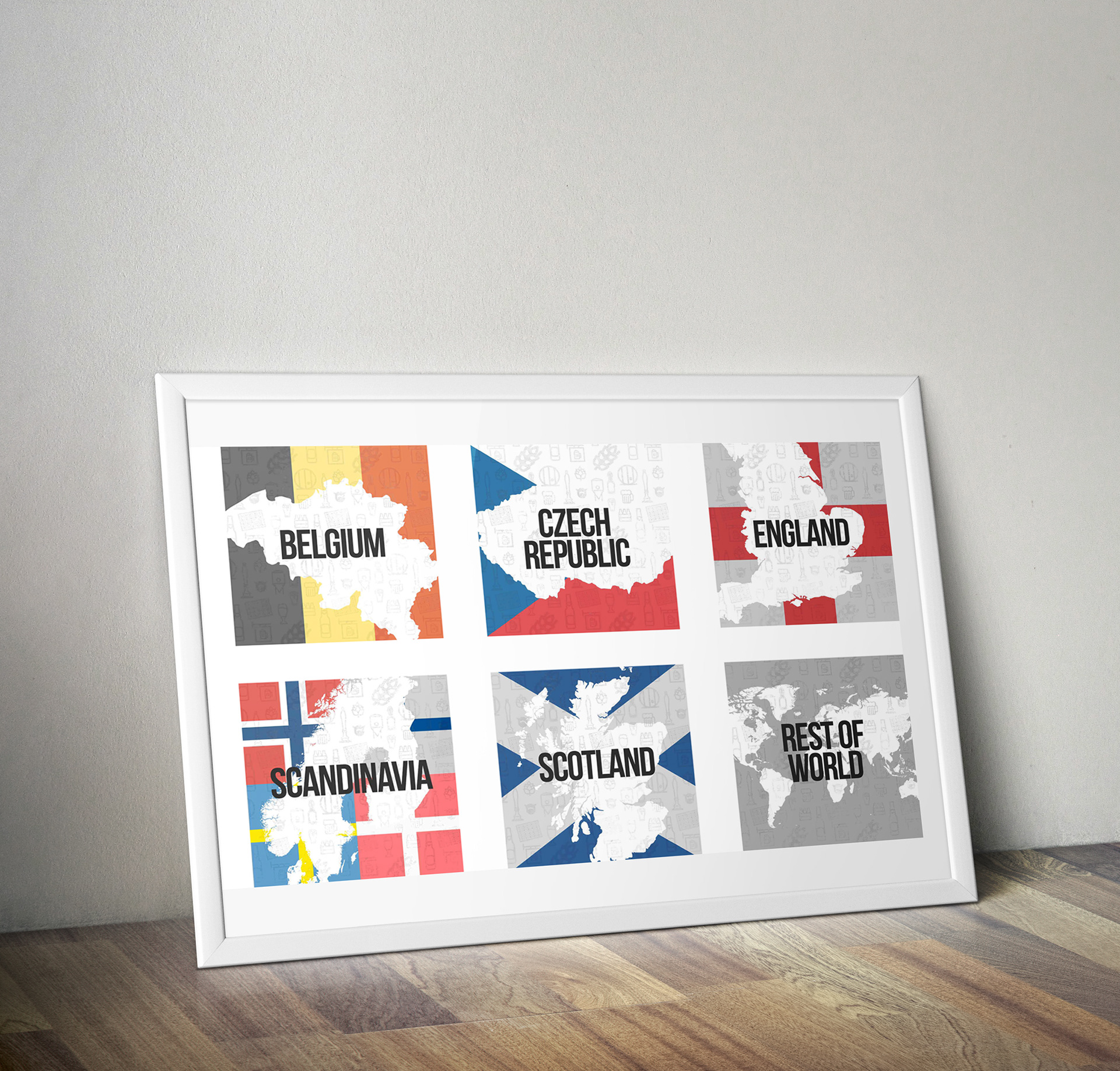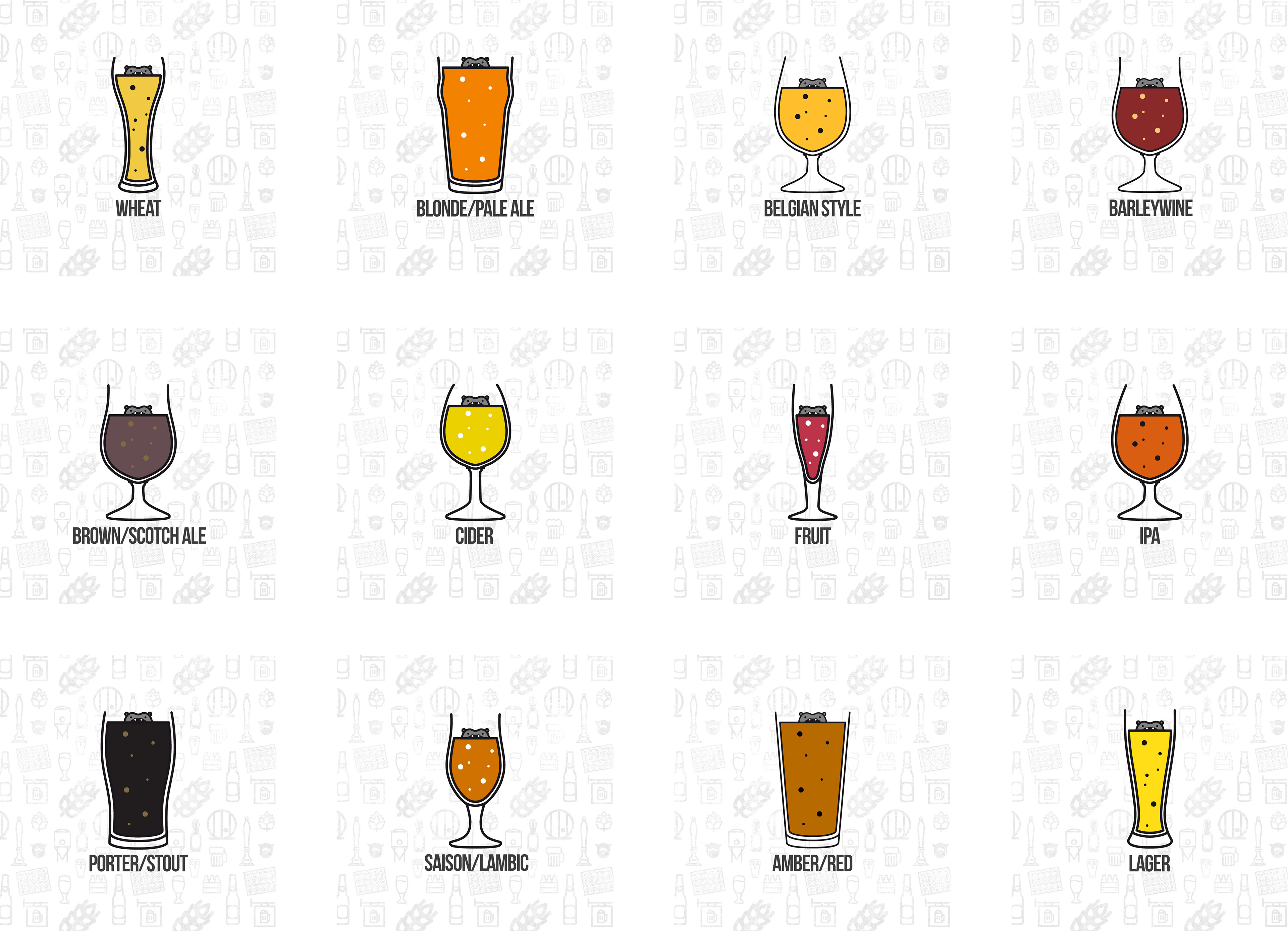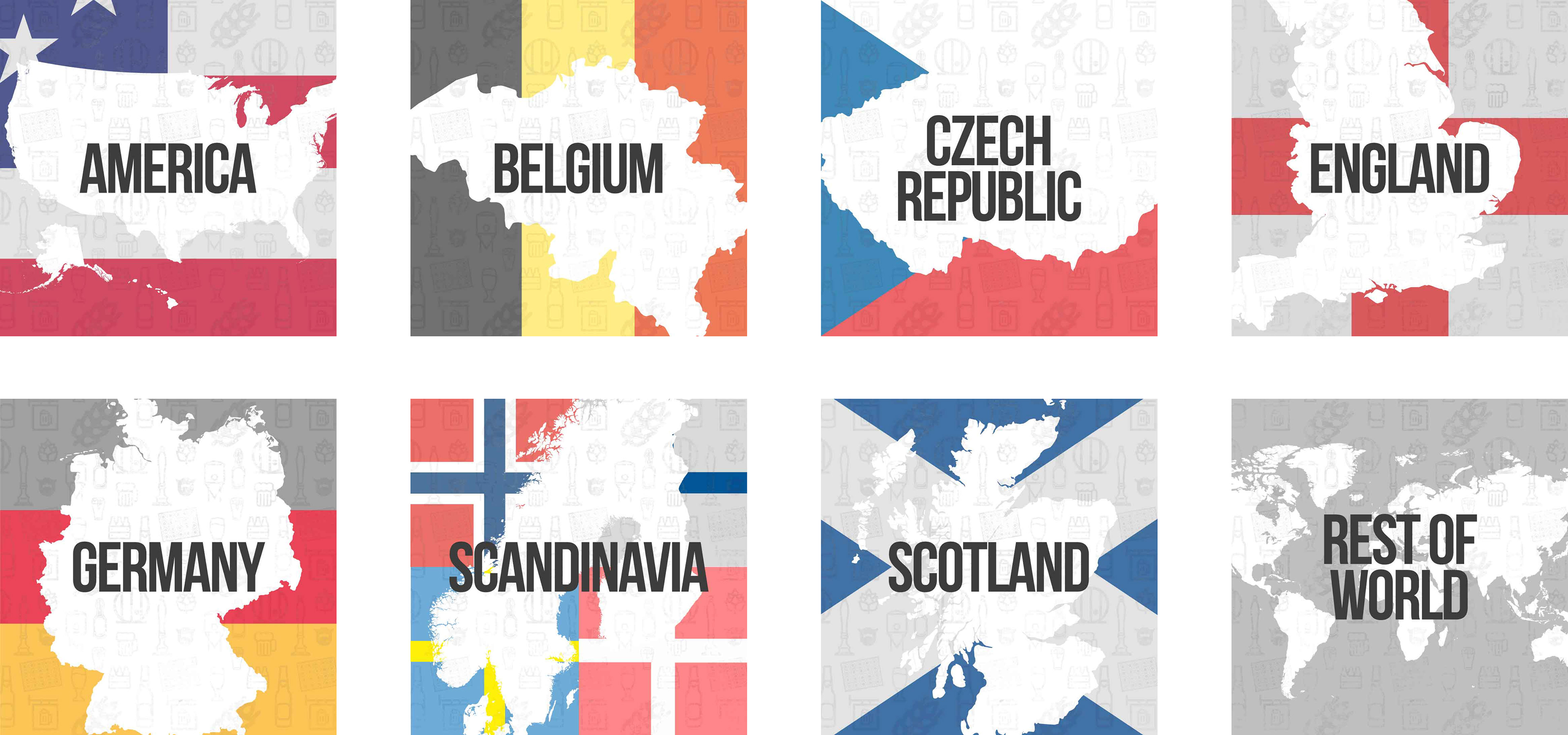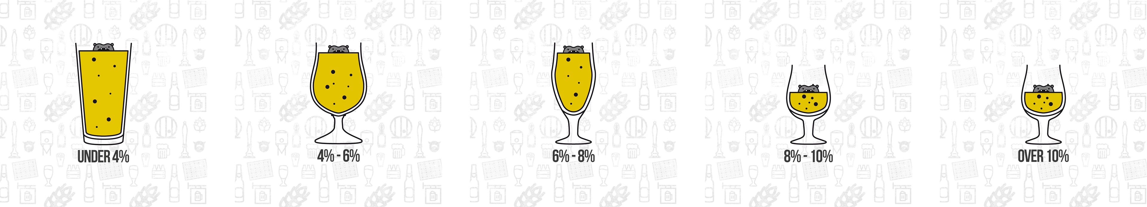 Graphics created: Beer glass illustrations, beer colour chart, ABV guide and country identifiers.